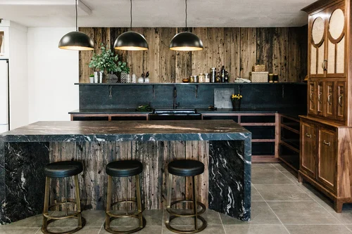 A countertop + custom cabinet showroom is suppose to inspire you to dream up your end result + challenge the expected. This vignette in Rocktops showroom is an ode to wood, mixing vintage train car wood from KC Furnishing Co. + walnut. Unexpected character abounds.